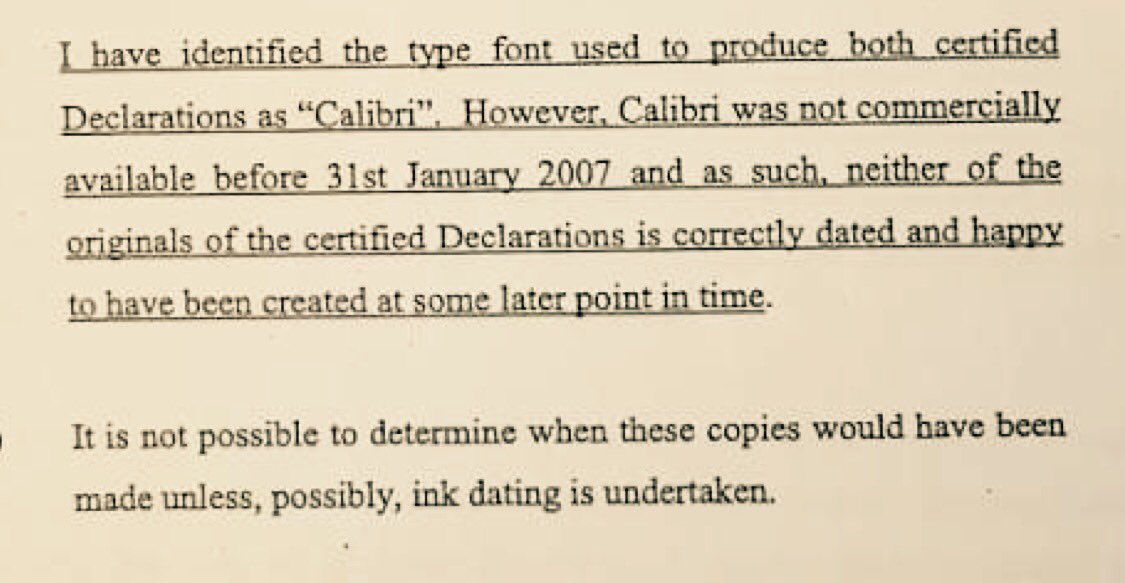 However, the expert said, Calibri was not commercially available before 31st January 2007 and as such, neither of the originals of the certified declarations is correctly dated and happy to have been created at some later point in time,”.